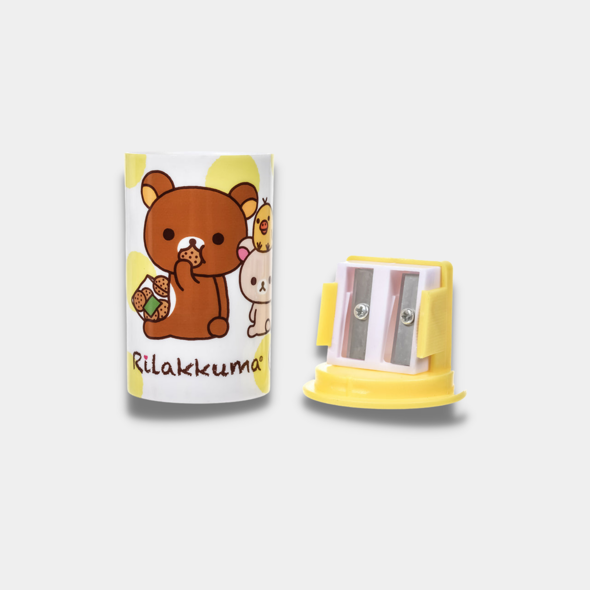 - A kawaii pencil sharpener with print of Rilakkuma eating biscuit